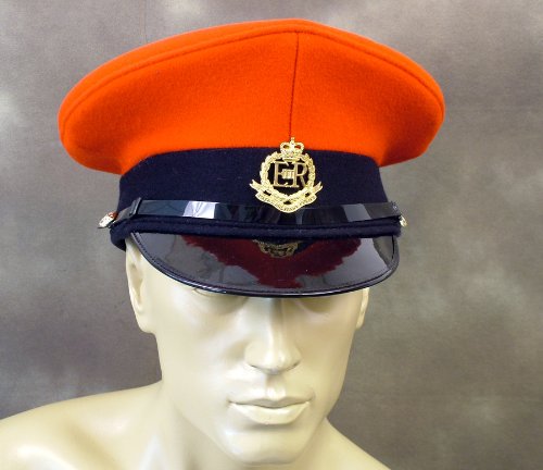 Original Item: Recently released from the British Ministry of Defense, these are original, virtually un-issued, Red Royal Military Police peaked service caps complete with gilt ER II Regimental Cap Badge.